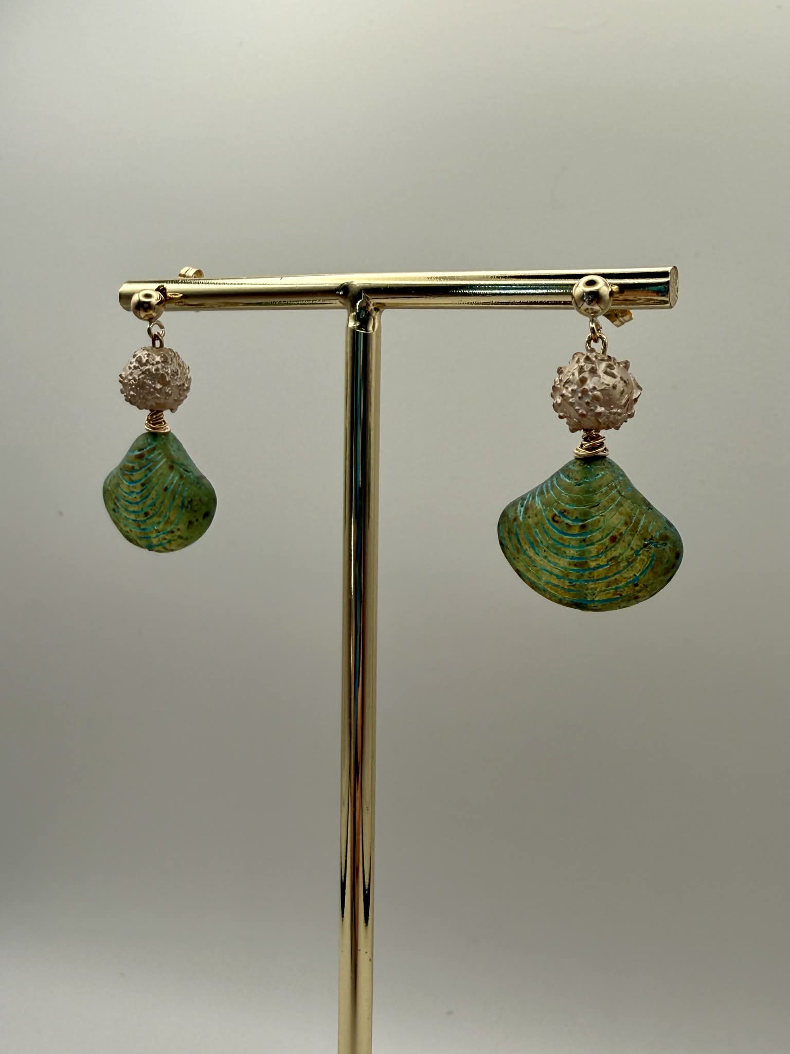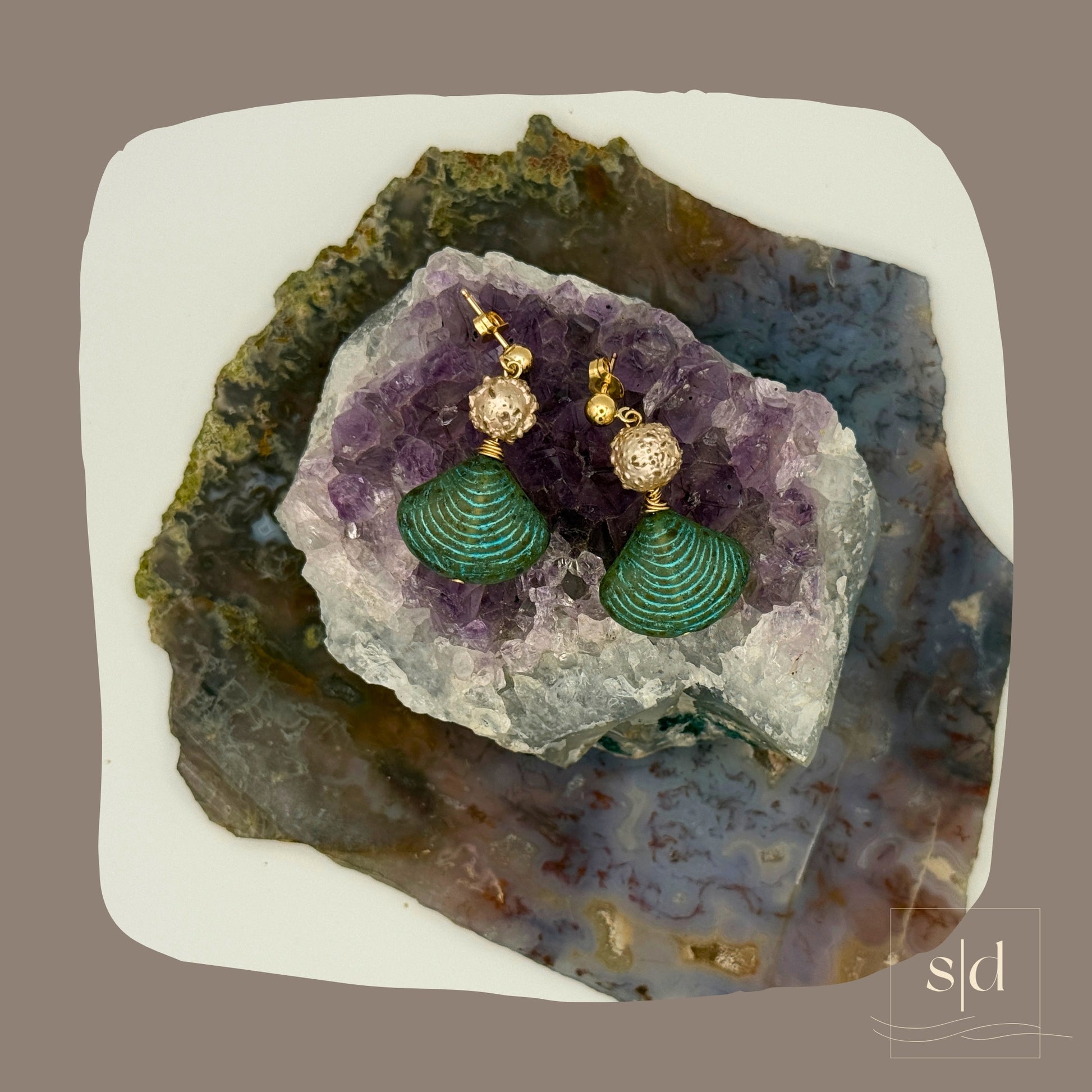 Dive into whimsy with these charming Czech glass clam earrings! This pair features delicate champagne pearls nestled atop Czech glass clam shells, creating a coastal-inspired look that's equal parts elegant and fun. Secured with durable gold-filled posts, these beauties are secure and comfortable for all-day wear. Perfect for ocean lovers, beach vacations, or anyone who appreciates a touch of quirky sophistication.