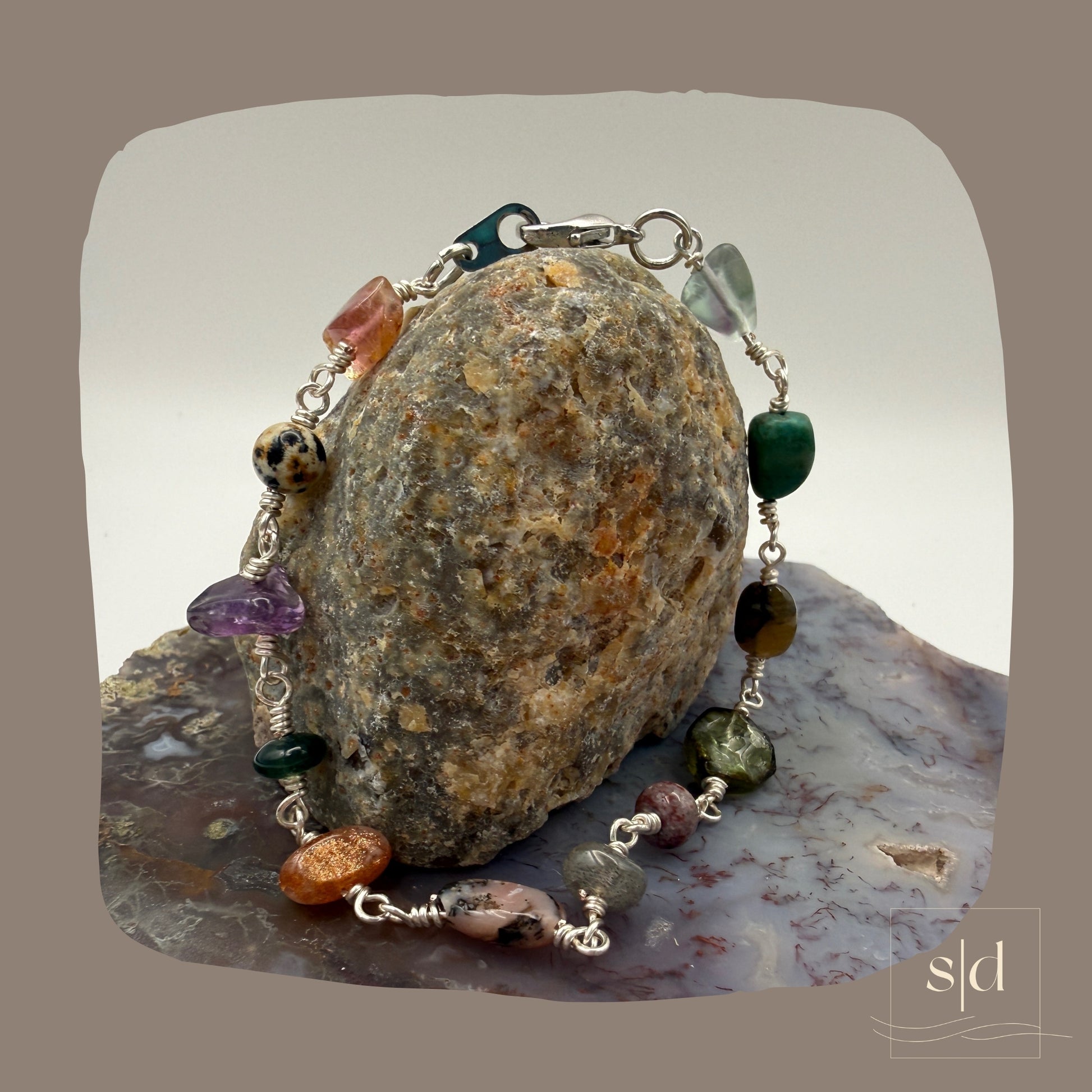Celebrate individuality with the Foundling Bracelet, where unique semi-precious stones unite to create a vibrant rainbow of color and personality. Strung together with care, these natural gems (pink opal, tourmaline, dalmatian jasper, sunstone, amethyst & more) showcase their own distinct character and beauty. Secured with a durable stainless steel lobster clasp, this piece is as reliable as it is stunning. Perfect for those who embrace what makes them different and find strength in their own story. Measures approx. 7.5" but can be adjusted upon request.