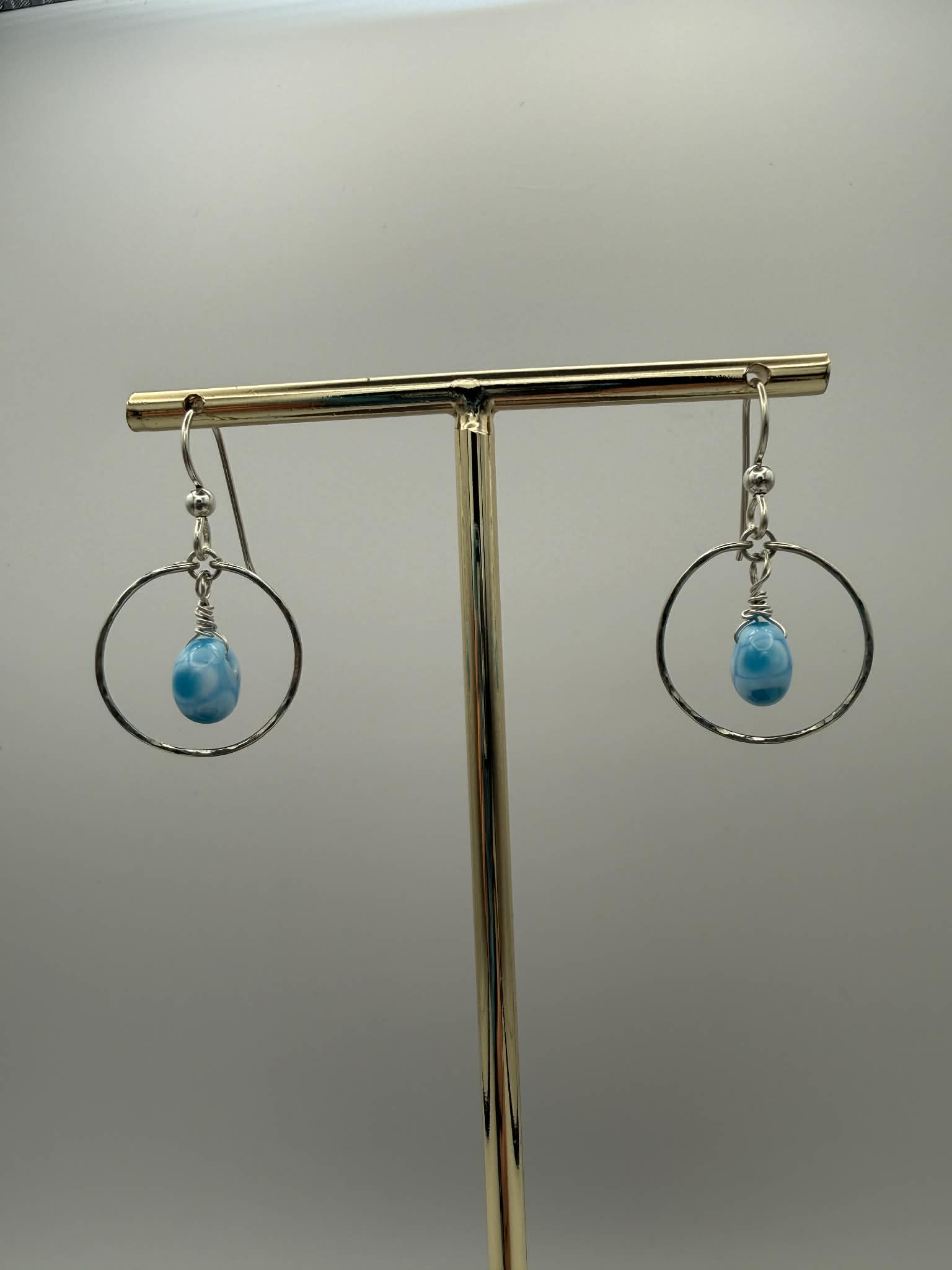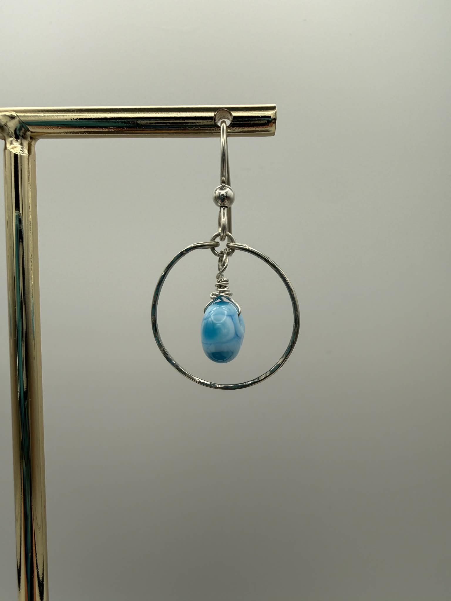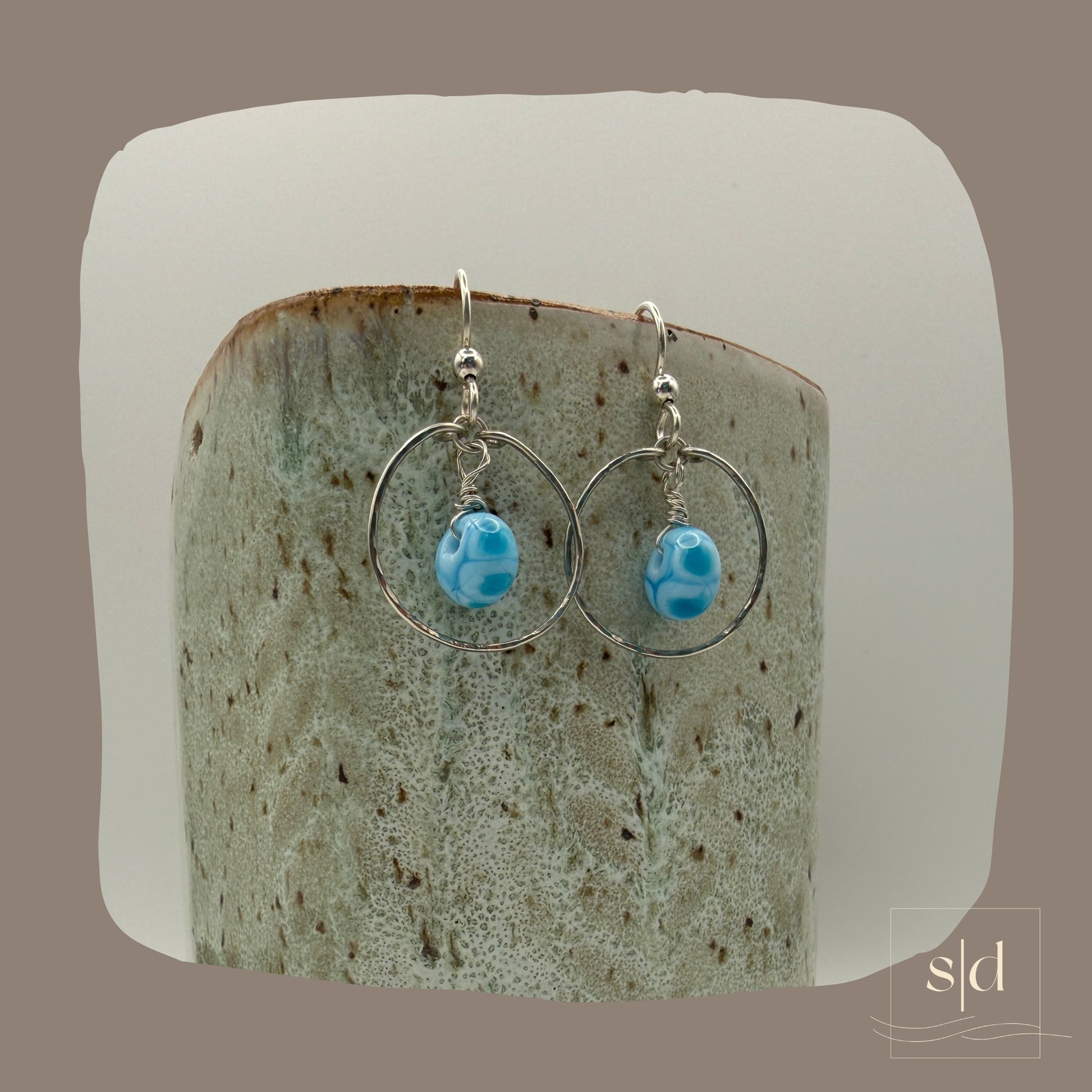 This pair is a true artistic collaboration featuring beautiful blue lampwork beads that give tropical water vibes. The beads are framed by hammered argentium silver hoops. The beads were handcrafted by a talented artist in Washington State, ensuring no two are exactly alike. Suspended from handmade argentium ear wires that are gentle on sensitive ears, these playful beauties bring artisan charm and a pop of personality to any look. Perfect for anyone who loves one-of-a-kind wearable art.